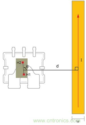 为了充分利用这些器件的CMR功能,包含IC的电路板应设计为两个霍尔板的外部磁场相同。这有助于最大限度减少载流PCB自身产生的外部磁场导致的错误。每个载流轨迹的三个主要参数据决定了导致IC错误:与IC的距离、载流体的宽度以及它和IC之间的角度。图2是IC附近载流体布线的示例。器件和导体之间的距离d是器件中心与导体中心的距离,电流路径宽度为w,器件和电流路径之间的角度θ是指连接两个霍尔板的直线与电流路径垂直线的夹角。