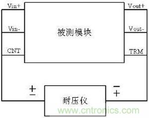作为模块电源的重要指标,标准中也规定了隔离耐压相关测试方法,简单的测试时一般采用等电位连接测试,连接示意图如下: