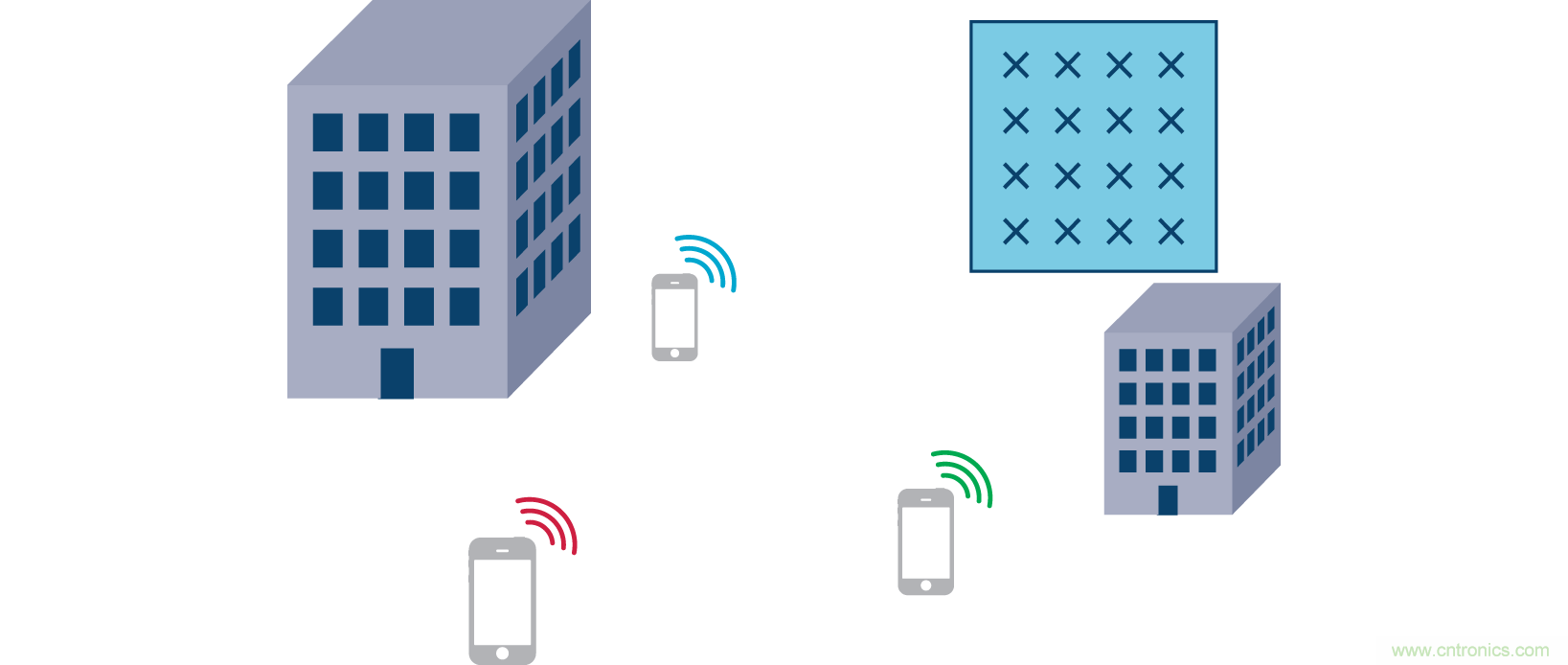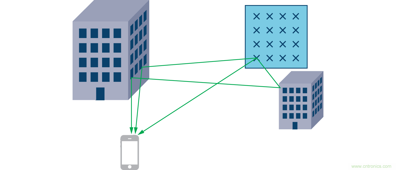 Massive MIMO可被视为更广泛意义上的波束赋形的一种形式,不过它与传统形式相去甚远。Massive意指基站天线阵列中的大量天线;MIMO意指天线阵列使用同一时间和频率资源满足空间上分离的多位用户的需求。Massive MIMO也认为在实际系统中,天线与用户终端—以及相反过程—之间传输的数据经过了周围环境的滤波。信号可能会被建筑物和其他障碍物反射,这些反射会有相关的延迟、衰减和抵达方向,如图2所示。天线与用户终端之间甚至可能没有直接路径。人们发现,这些非直接传输路径同样有利用价值。