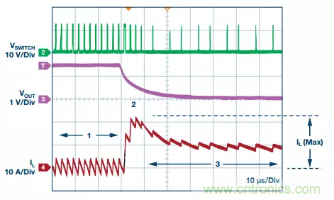 最初,峰值电感电流由选定的电感值、电源开关导通时间、电路的输入和输出电压以及负载电流设置(图中用“1”表示)。当电路短路时,电感电流迅速上升,直至达到限流点,即 RS × IINDUCTOR (IL)等于最大电流检测电压,以保护器件和下游电路(图中用“2”表示)。然后,内置电流折返限制(图中数字“3”)进一步降低电感电流,以将热应力降至最低。