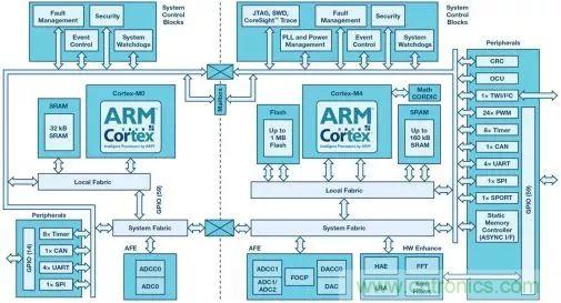 ADSP-CM419F处理器基于ARM® Cortex®-M4处理器内核,浮点单元工作频率高达240 MHz,集成的ARM® Cortex-M0处理器内核工作频率高达100 MHz。这使得单个芯片可以集成双核安全冗余性。ARM Cortex-M4主处理器集成搭载ECC的160 kB SRAM存储器、搭载ECC的1 MB闪存、加速器以及专门针对功率转换器控制而优化的外设(如24个独立PWM),以及由两个16位SAR类ADC、一个14位Cortex-M0 ADC和一个12位DAC构成的模拟模块。ADSP-CM419F采用单电源供电,利用内部稳压器和一个外部调整管自行生成内部电压源。它采用210引脚BGA封装。