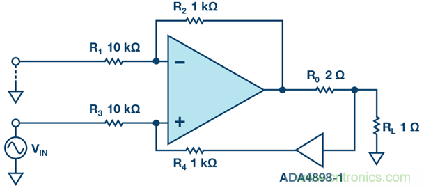 虽然较大的R2会降低电路速度与精度,但在反馈路由中插入一个缓冲器,形成一个增强型Howland电流源可以解决这一问题,如图2所示。所有通过R0的电流都流入RL。输出电流由公式2计算。
