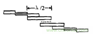 交指型微带带通滤波器的工作原理可以这样解释:将平行藕合微带滤波器相邻的两个藕合线节从中点处切断,并折迭起来,合并为一根藕合线节,将其一端短路接地,另一端开路,并保持相邻两级线节之间的藕合间隙不变,形成交指型结构。如图2所示
