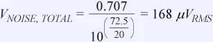 (3)VNOISE, ADC = 92.2 μV rms, 带放大器前端的系统SNR为 = 72.5 dBFS, 利用公式3计算系统噪声得到168 μV rms。