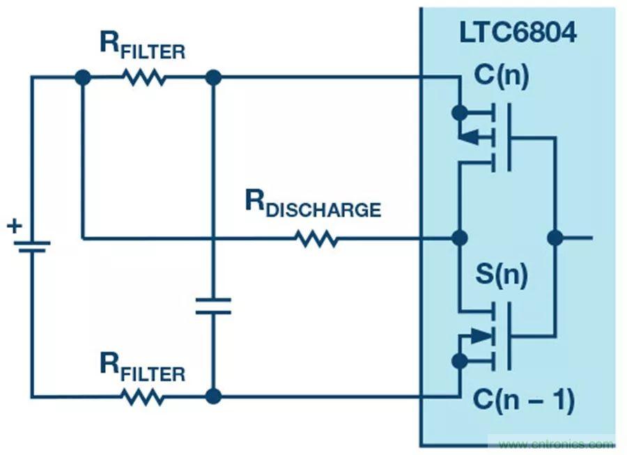 LTC6804 具有内部被动均衡功能 (图3)。如果需要,它还可以配置外部 MOSFET(图 4)。它还具有可选的可编程被动均衡放电计时器,可为用户提供更多的系统配置灵活性。