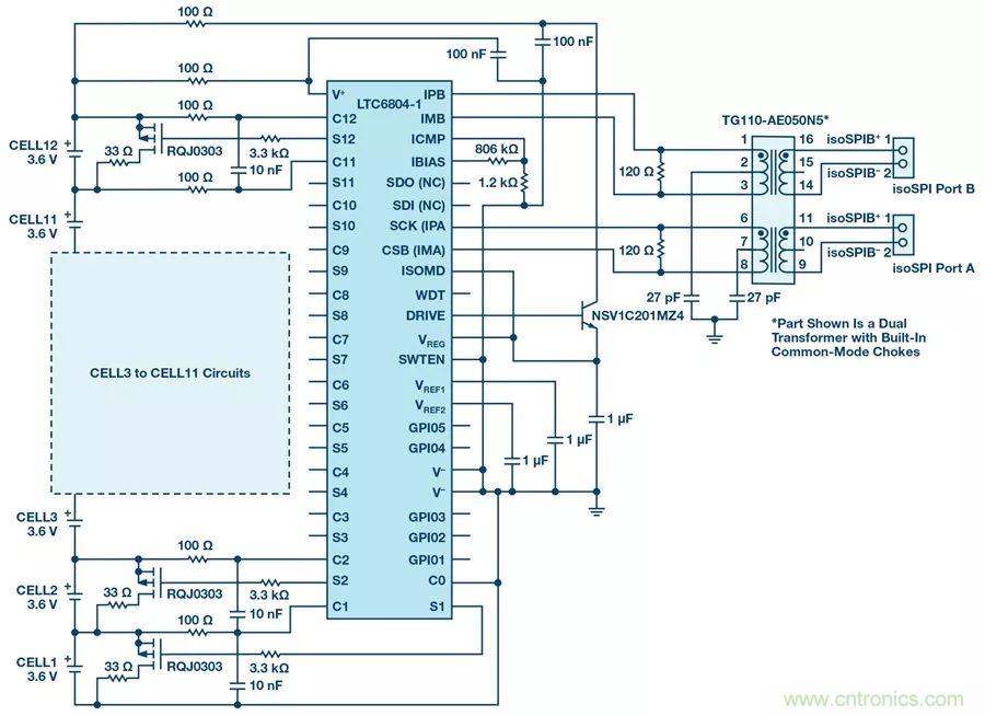 图 2. 采用外部被动均衡的 LTC6804 应用电路