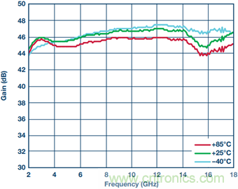 本文将演示2 GHz至18 GHz的 设计,它使用ADI器件实现大于40 dB的限幅动态范围, 输出功率变化小于2 dB,噪声系数为4 dB,工作温度范 围为–40°C至+85°C。利用ADI独特的MMIC优势和子系统设 计能力,我们能够提供出色的解决方案,满足客户对高 级应用的需求。下文展示了性能测试结果。