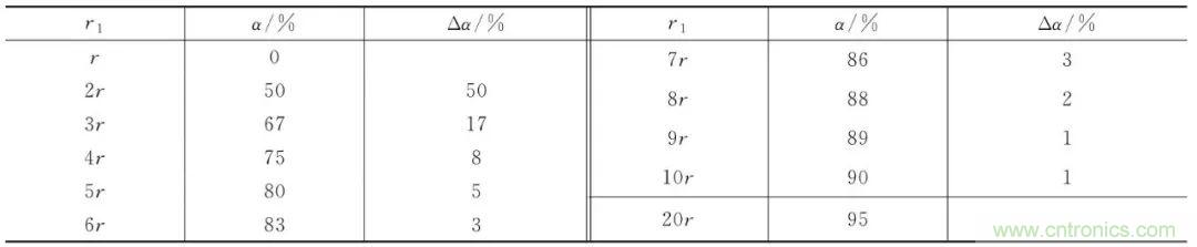 接地电阻的大部分是集中在接地电极的附近。假设从半球状电极的表面到距离r1之间的电阻为R1,从表面到无限远点的全接地电阻为R时,则R1与R之比为α