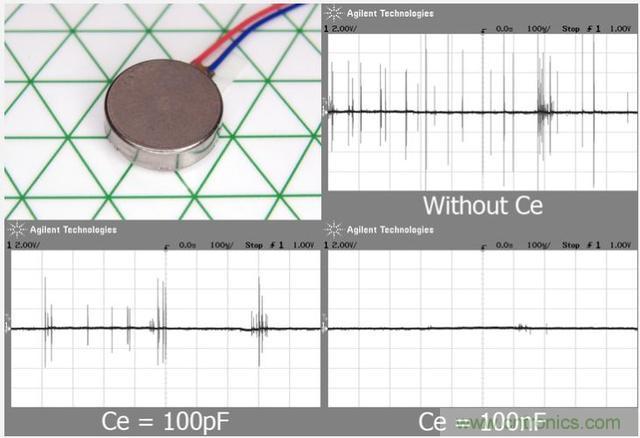 最简单的解决方案是在电机端子之间放置一个陶瓷电容器,尽可能靠近电机。 这被称为去耦电容,通过去除一些高频噪声信号来降低EMI。 这些去耦电容的常用值介于100pF和100nF之间,具体取决于电机的大小。下面显示了一些示例测试结果。