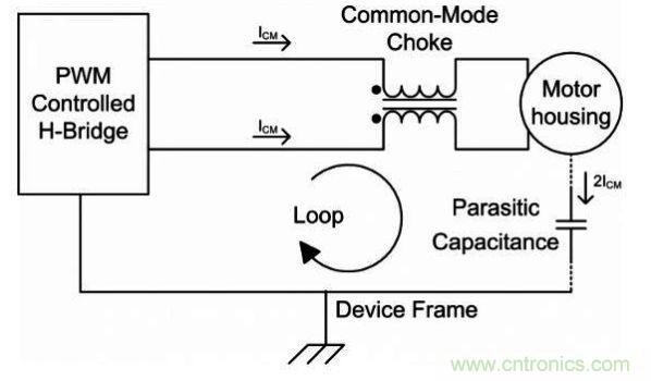 辐射和传导发射的另一个来源可能来自驱动电路。理想情况下,典型的H桥电路应为电机提供恒定电流,但由于驱动电路中电流的快速和频繁切换,该电流具有快速上升时间尖峰。另一个重要问题是通常电机离驱动器很远,这会在电机引线和设备框架之间产生相当大的环路面积。辐射电位是环路面积的直接函数;环越大,EMI噪声越大。