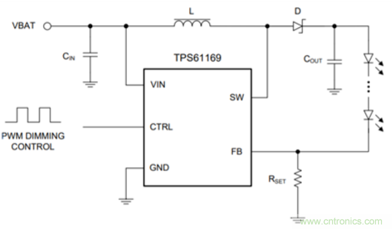 TPS61169 是一款升压型LED驱动器,内部集成一个 40V、1.8A MOSFET,可针对小型或大型面板背光照明驱动单个 LED 或 LED 串。默认的白色 LED 电流通过外部传感器电阻 RSET 设定,反馈电压稳压至 204mV。运行期间,LED 电流可通过施加到 CTRL 引脚上的脉宽调制 (PWM) 信号加以控制,该信号的占空比决定反馈基准电压。TPS61169 不会突发 LED 电流,因此不会在输出电容器上产生可闻噪声。为提供最佳保护,该器件集成了 LED 开路保护特性,该特性会在 LED 开路状态下禁用 TPS61169,以防止输出电压超过 IC 最大绝对额定电压。