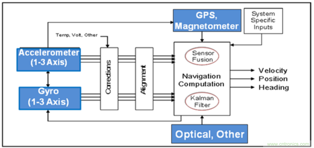 图3. 惯性导航系统,在卡尔曼滤波器的辅助下合并多种类型的传感器