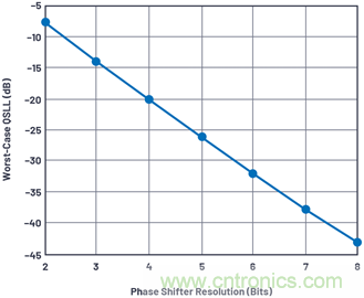 图11.最糟糕的量化旁瓣电平与移相器分辨率的关系。