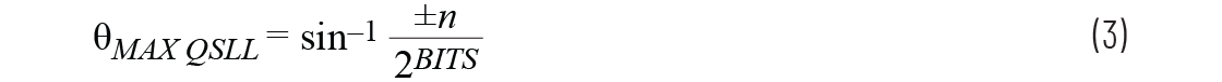 注意,在30°时,所有量化误差都趋于0,这可以显示为sin(30°) = 0.5时的结果。请注意,对于任何特定的n位移相器,在最糟糕电平下的波束角度在更高分辨率n下会显示零量化误差。在这里可以看出描述的最糟糕旁瓣电平下的波束角度,以及QSLL在每位分辨率下改善了6 dB。