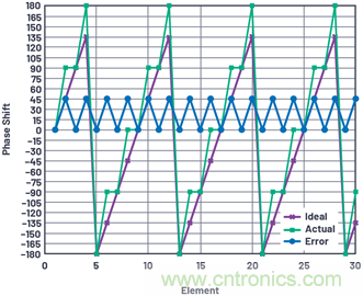 图6显示之前描述的编程采用θRES波束分辨率角度的2位30元件线性阵列的移相器设置和相位误差。一半阵列设为零相移,另一半设为90°LSB。注意,误差(理想量化相移与实际量化相移之间的差异)曲线呈锯齿状。