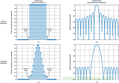 图3.显示变窄元件转化为辐射能量加权的图表;(A)对所有元件使用统一加权;(b)正弦函数在空间内辐射;(c)对所有元件使用海明窗加权处理;以及(d)以加宽主波束为代价,将辐射旁瓣降低到40 dBc。