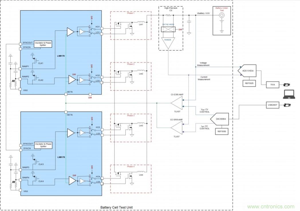 电池测试单元的功率部分主要包括模拟控制器,半桥驱动,MOSFET,输入输出保护器。电能变换拓扑最常用的就是半桥整流的Buck/Boost变换电路,主要是因为电路结构简单,控制也不复杂,同时能满足目前市面上低至0.5A或者更小以及高至上百安培的输出电流的应用场合,不同的是在大电流应用场合,为了保证良好的散热性能并减小体积,多采用多相Buck/Boost并联的方式,无论单相还是两相甚至多相,不变的是控制方案。