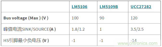 当测试单元的输出电流在10A左右或以内时,驱动能力要求不大的条件下一般1A左右即可满足要求,使用较为常见的有LM5109B和LM5106,表1。