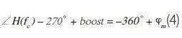根据功率级滞后和所需的相位裕度jm,我们可以推导出一个与所需相位边限提升量相关的公式。我们都知道,反相运算放大器和原点上的极点会导致270°滞后,再加上以选定交越频率fc表征的功率级相位。这些数字相加,结果应该就与-360°限值相差相位裕量。因此,我们可以这样写: