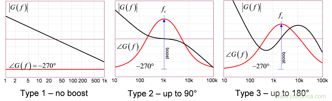 在第2种类型中,零点位于极点之前,会使相位随着频率升高而增加。极点在稍后出现,然后相位边限提升返回至零点。通过扩散零点和极点,您可以根据需要调整相位边限提升,最高可达90°。请注意,如果将极点和零点重合,补偿器又会变成第1种类型,相位边限提升为0°。