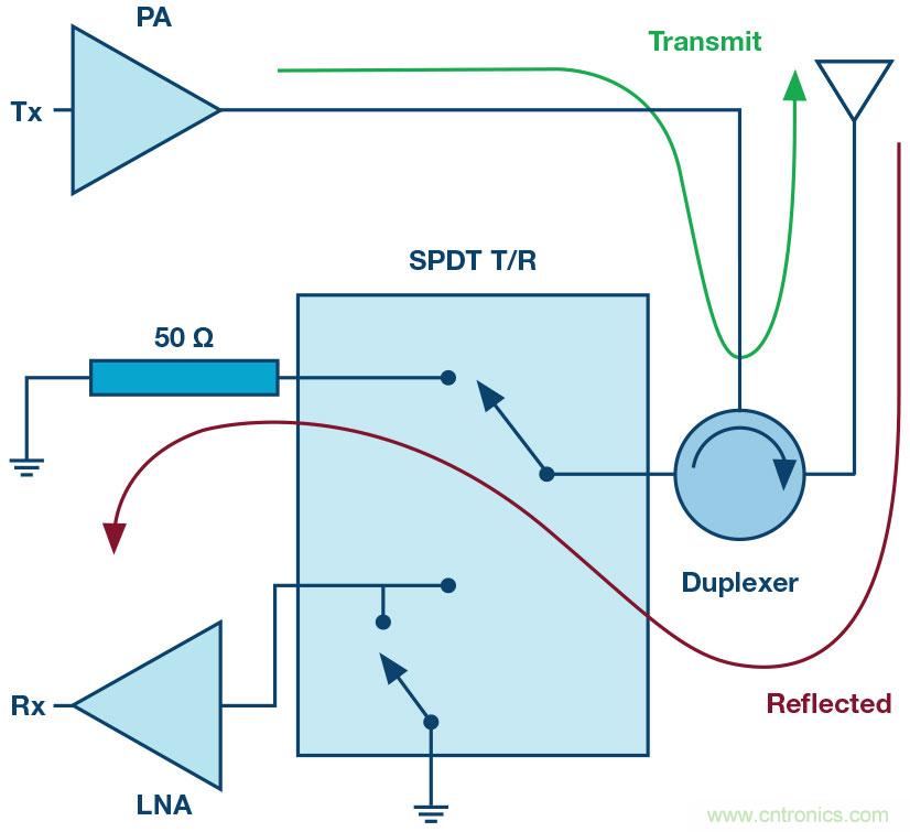 在时分双工 (TDD) 系统中,天线接口纳入了开关功能,以隔离和保护接收器输入免受发送信号功率的影响。该开关功能可直接在天线接口上使用 (在功率相对较低的系统中,如图 1 所示),或在接收路径中使用 (针对较高功率应用,如图 2 所示),以保证正确接至双工器。在开关输出上设有一个并联支路将有助改善隔离性能。