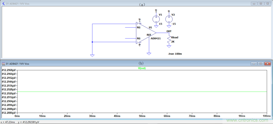 如图3.11(a),使用LTspice设计AD8421在增益为1倍,供电电源为±15V。如图3.11(b),输出总失调电压的瞬态分析结果为412.292μV,等同于理论计算值。