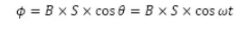 此时,假设线圈表面的平行方向(中间图中的黄线)和相对于磁通密度方向的垂直线(黑色虚线)形成角度为θ(=ωt),则穿透线圈的磁通量Φ由下式表示: