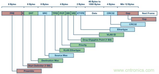 图1.以太网帧: 与TSN数据流标识相关的数据字段用绿色表示。