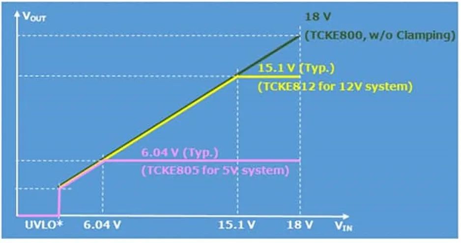 图 4:TCKE8xx 系列电子保险丝包括多种型号,钳位电压为 6.04 V 的 TCKE805 适用于 5 V 系统,钳位电压为 15.1 V 的 TCKE812 适用于 12 V 系统,而 TCKE800 则没有钳位电压。(图片来源:Toshiba)