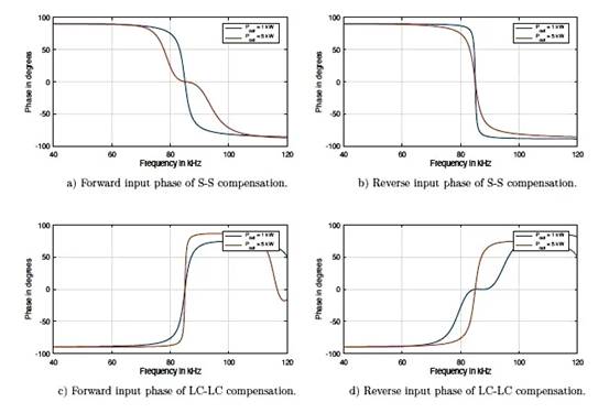 相应的输入相位响应如图 5 所示。相位响应在 SS 正向中开始变平(在整个工作范围内),从而限制了可用的 ZVS 范围。而在反向模式下,由于高质量因素导致的急剧变化需要大量的无功功率。在 LC-LC 中可以观察到相同的趋势,但响应互换。