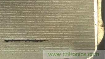 热冲击主要发生在波峰焊时,温度急剧变化,导致电容内部电极间出现裂缝,一般需要通过测量发现,研磨后观察,通常是较小的裂缝,需要借助放大镜确认,少数情况下会出现肉眼可见的裂缝。