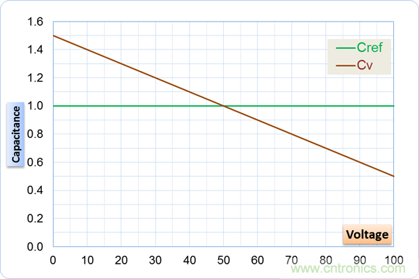关于电荷和能量的简单方程在推导时存在静态电容这一隐含假设。对于非线性电容,必须通过在电压上分别积分电容和电荷来导出电荷和能量。为了进一步说明这一点,请考虑图3描述的两个电容器。基准值由电容器CREF提供。另一电容器CV从1.5 x CREF 到0.5 x CREF线性变化。在100V时,它们携带相同的电荷。