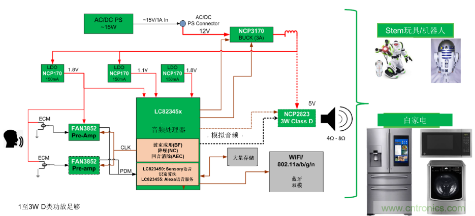 图2所示为本地VUI方案的一个示例应用框图及评估板。采用安森美半导体的超低功耗音频处理单芯片LC82345X、麦克风预放大器FAN3852、低压降稳压器(LDO)NCP170、同步PWM开关降压稳压器NCP3170、单声道音频功率放大器NCP2823。安森美半导体凭借在电源管理的经验和专知,使这方案实现超低功耗,这是此方案与其他竞争对手方案相比的一个优势。现有的方案虽然未集成WiFi、蓝牙双模的模块,但安森美半导体已收购了WiFi领袖Quantenna,已具备相关技术,未来会考虑将WiFi模块也集成进去。