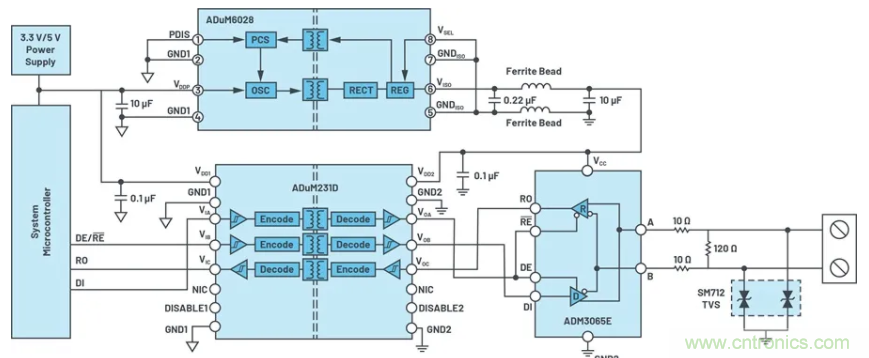 为了提高电气要求严苛的电机控制、过程自动化和无线基础设施等应用中的抗扰度,可以添加电气隔离装置。利用ADI的 iCoupler® 和 isoPower® 技术,可以向ADM3065E中增添兼具增强型绝缘和5 kV rms瞬态电压的电流隔离。ADuM231D 提供三个5 kV rms信号 隔离通道,具有精密时序性能,可以在高达25 Mbps速度下可靠运 行。ADuM6028 隔离式DC-DC转换器可提供所需的隔离电源,耐受额定值为5 kV rms。使用两个铁氧体磁珠可以轻松满足EMC相关标准要求,例如EN 55022 Class B/CISPR 22,从而可实现6 mm × 7.5 mm紧凑型隔离式DC-DC解决方案。