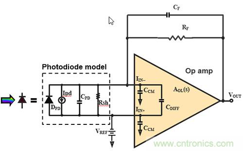 图2:零反向偏置TIA电路,以简化模式观察光电二极管和放大器。该版本考虑了光电二极管结特性以及放大器寄生输入电容。(图像来源:Digi-KeyElectronics)