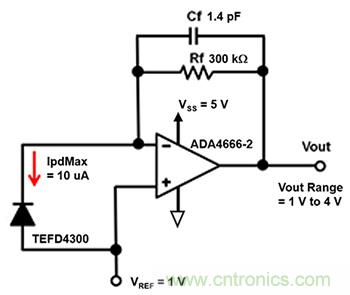 在ADAS和LiDAR应用中,传感器正在执行位置感应活动,要求它们快速。适用于ADAS和LiDAR系统的组件是VishaySemiconductorTEFD4300硅PIN光电二极管和ADI公司的ADA4666-2放大器(图4)。VishayTEFD4300硅PIN光电二极管可感应可见光和近红外辐射。这种高速光电探测器适用于位置传感,高速数据传输光电检测,光学开关和编码器。TEFD43000伏偏置结电容(CPD)为3.3pF,分流电阻(Rsh)为67GΩ。在该系统中,最大预期输出电流光电二极管电流为10μA(IpdMax)。