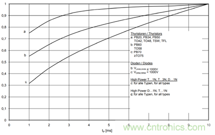 对于周期短于10ms的正弦半波,最大额定∫i²dt值如图13所示。电压应力和重复性同样适用于通态浪涌电流。超过最大允许值时,器件可能损坏。此外,尤其是对大直径晶闸管而言,不得超过允许的临界开通电流变化率(di/dt)cr。