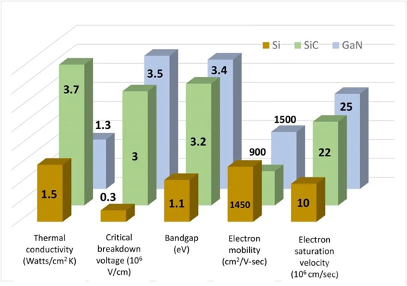 与此同时,硅MOSFET有改进过的最新“超结”类型,导通电阻足够低,能与IGBT相媲美,迈入kW级电平范围,且具有工作频率可以非常高的优势以及所有相关优点。不过,在较高功率下,由于“平方”效果,较大的电流仍将在导通电阻内产生不可接受的I2R损耗,而且因为即使在低功率下也需要比以往更高的效率,所以设计师们现在把改进期望寄托在硅的替代产品上。宽带隙(WBG)材料碳化硅(SiC)和氮化镓正好合适,它们的单位晶粒面积导通电阻较低,电饱和速度更好。它们还具有其他优点,如每毫米的临界击穿电压较高、能实现较小的芯片体积并进而实现较低的电容以及可能较高的开关速度。SiC的导热系数比硅或GaN好得多,它不仅额定结温较高,还能让给定晶粒和封装具有更好的功率耗散能力(图1)。