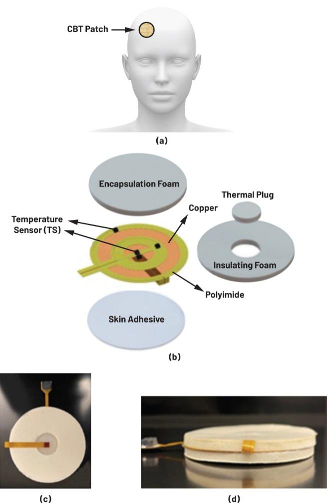 图1.CBT器件设计。(a)将可穿戴热检测器件置于前额以估算人体CBT;(b)CBT贴片的3D分解图;(c)柔性CBT贴片的人体组织侧;(d)柔性CBT贴片的侧视图。