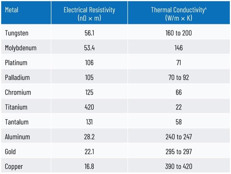 由于热和电都是通过电子的运动来传输的,因此二者密切相关。根据威德曼-弗朗茨定律3,相同温度下不同金属的热导率与电导率之比约为常数。换句话说,热阻越大,导电性越差,反之亦然。幸运的是,在本用例中,由于温度范围相当有限,因此使用市售的常见金属即可。
