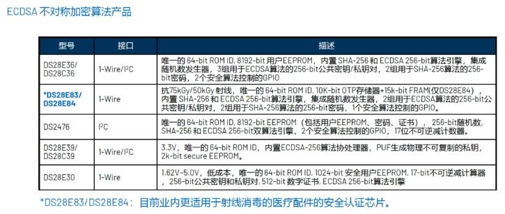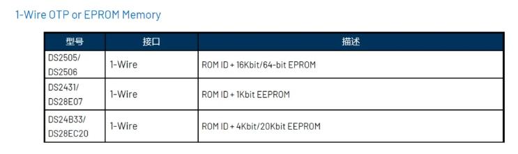 安全性方面,从简单的、存储器容量大小各异的OTP和EEPROM存储类芯片(如DS2431),到集成多种对称算法SHA的认证芯片(如DS28E16),再到集成非对称算法ECDSA的认证芯片(如DS28E30),以及集成更高密码保护方式的PUF(物理不可复制特性)技术(如DS28E39);