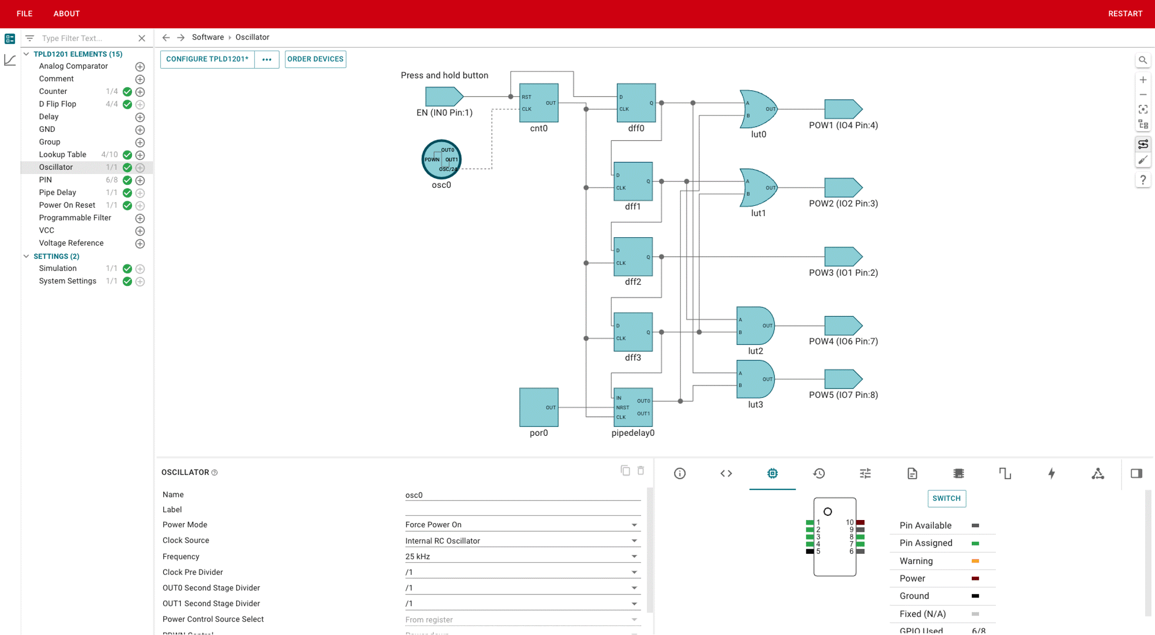 设计电路并运行仿真后,您只需按下 CONFIGURE TPLD 按钮,就可以通过 TPLD 编程器和评估模块轻松地临时配置器件。如果您想要对器件进行永久编程,可以在菜单中选择一个复选框。
