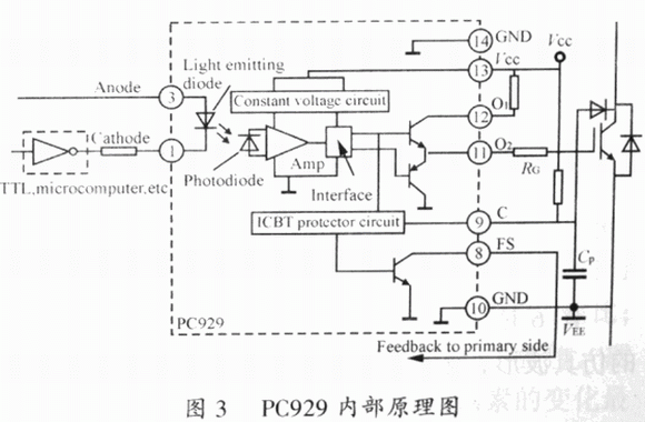 所谓降栅压慢关断技术指的是,当IGBT出现过流时,先将其栅极驱动电压降低,然后将其关断,一是延长了IGBT能够承受过流的时间,二是可以降低器件受到过流冲击的幅度。过流时器件通态压降升高,管子瞬时热损耗急剧增加,为防止器件热损坏,过流时间应足够短,一般<10μs。SHARP公司的光耦合器PC929将这一功能和驱动电路集成在一起,器件内部原理图如图3所示。