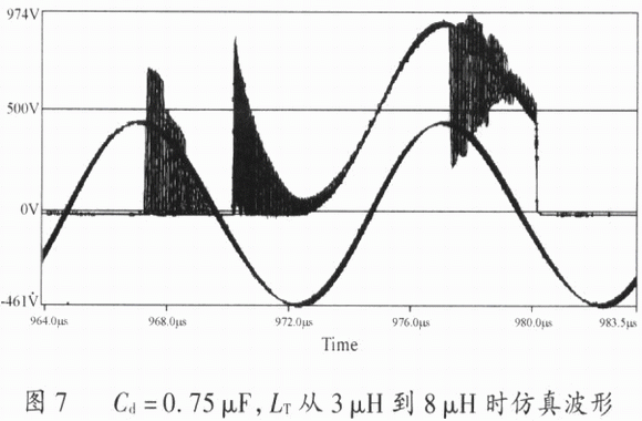 上述仿真波形中存在的振荡,均是由器件的寄生电容、二极管反向恢复过程引起的。图7是在LT从3μH变化到8μH时,管子关断时承受的电压波形和负载输出电压波形。可以看出LT在这一范围取值是比较合适的。