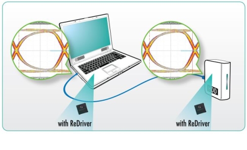 如果放在接收器之前,转接驱动器可以有效打开信号眼图的开口,从而将信号质量恢复到可以接收的范围内。转接驱动器可以调节信号、使用信号均衡的功能减少信号衰减和抖动,因此可以在更长的距离和通过多个连接器的情况下提供干净的信号传送通道。信号可以恢复原有的强度再次传送,就像是将信号通道拆成数个段落,并且在每个段落恢复信号的质量。转接驱动器也允许产品设计师依照特定的应用类型调整最佳的信号均衡效果,因此可以确保设备可以通过最严格的USB3.0认证要求。