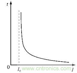 电动机的过电流大小与过电流时间之间的关系称为过载特性。在实际运行中,电机短时过载和较低程度的过载,是难以避免的,也是可以允许的,过电流大小和过电流允许时间呈反比,称为反时限保护特性,见下图。