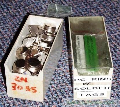 作者有一个朋友的老婆是护士,有一天作者注意到他们家有一种装缝合线的塑胶盒子,看起来很好装东西;朋友的老婆说能帮作者弄到很多个,而它们也被证明很适合收纳功率电晶体,以及音讯/RF插头插座等各种零件,如下图: