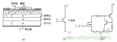 IGBT相当于一个由MOSFET驱动的厚基区GTR。从图中我们还可以看到在集电极和发射极之间存在着一个寄生晶闸管,寄生晶闸管有擎住作用。采用空穴旁路结构并使发射区宽度微细化后可基本上克服寄生晶闸管的擎住作用。IGBT的低掺杂N漂移区较宽,因此可以阻断很高的反向电压。