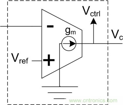 OTA是压控电流源放大器(见图1),它的输出电流与放大器的差分输入成正比。放大器跨导增益定义为gm。OTA要求的裸片面积比相互竞争的电压放大器更小(就同等带宽而言),常用作电源控制器及稳压器IC的反馈放大器。