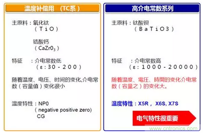 目前主流的陶瓷电容分类主要是按材质来分,不同的材质,会有不同的容值,有不同的温度系数。目前主要有以下材质:X5R,X7R,C0G,NP0,X6S,X7T等,这些又可以分两大类,温度补偿型和高介电常数,主要是温度系数不同,温度补偿型主要是容值随温度变化小,但是容值做不高。高介电常数型,温度系数不好,但是容值可以做的比较高。